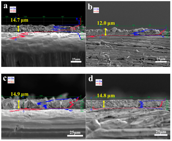 Figure 5 shows several representative cross-section SEM images of the samples after electrodeposition with different electroplating parameters. The blue EDS curves in the figures represent the distribution of metal zinc, which can illustrate the thickness of the zinc coating. Figure 5a shows that at room temperature, the thickness of the zinc coating could reach 14.7 μm with only 15 min of electrodeposition with a current density of 4 mA·cm−2. In previous reports [33,34,35,36], as shown in Table S1, the electrodeposition rate of ChCl-based DES was very slow, and most of them needed to be carried out at high temperature. However, our new DES electrolyte had a much faster electrodeposition rate at room temperature.