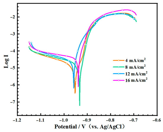 From Figure 8, it was observed that the Tafel curves of different zinc coatings were very close to each other. In this case, it can be inferred that the current density had little effect on the corrosion resistance of the zinc coatings.