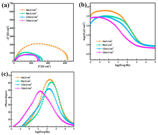 EIS was used to further evaluate the corrosion resistance of the zinc coatings. Figure 9a displays the Nyquist plots of the coatings. Among the four Nyquist plots, the plot for the zinc coating deposited at 4 mA·cm−2 had the maximum semicircle radius. Radius of the capacitive loop decreased with the increase in the current density. The Bode impedance plots and Bode phase plots are shown in Figure 9b,c. From the figures, it can be seen that with the increase in the current density, both the impedance value in the low frequency region and phase angle of zinc coating decreased. Therefore, at the same electrodeposition temperature, the lower the current density, the better the corrosion resistance of the coating.