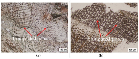 Microstructure images of (a) TSDa and (b) TSD. Red arrows indicate compacted and elongated pores in (a) and (b), respectively.