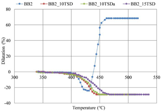 Thermoplastic parameters determined by optical dilatometer tests for BB1 and BB2 with different addition of TSD and TSDa.