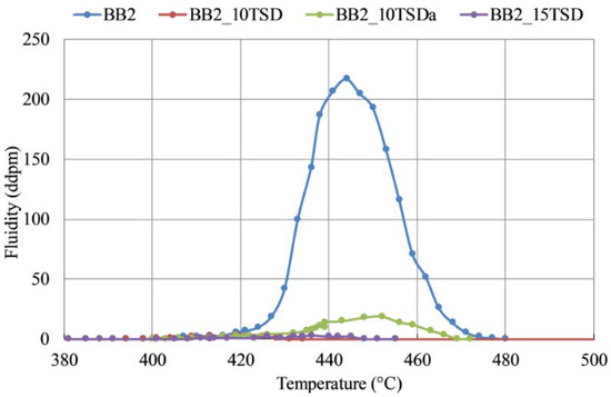 In the Gieseler tests, see Table 4 and Figure 4, all blends with bio-coal addition show low fluidity compared to the BB2T reference blend (217 ddpm), which contains HV2, a coal with high fluidity. However, the fluidity of BB2_10TSDaT with 10% TSDa is significantly higher (19 ddpm) than when adding 10% or 15% TSD (4 and 3 ddpm). In addition, the maximum fluidity temperature is closer to the reference blend than for BB2_10TSD T and BB2_15TSD T.