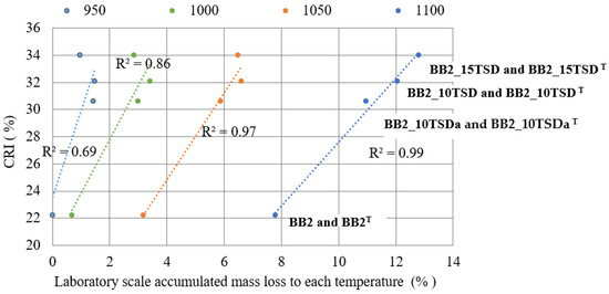 Correlation between CRI for coke produced in technical scale and mass loss up to 950, 1000, 1050 and 1100 °C in TGA tests for coke produced in laboratory scale.