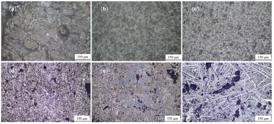 When CeO2 is added in amounts less than 10%, the slag is bluish green in color, has little porosity, and has a compact structure. The color of the slag changes to black with a considerable local porosity when CeO2 is added in amounts greater than 10%. Epoxy resin was used to embed the slag sample, which was then examined under a light microscope. Figure 1 shows the mineral-phase structure of slag. The mineral-phase structure shows that the microstructure of the slag without rare-earth-oxide treatment is bulk calcium aluminate and doped with rod-like calcium silicate mineral-phase structure. When the CeO2 content is less than 15%, the slag is dominated by small crystals, with no obvious dendritic crystals. Dendritic crystals dominate the slag phase structure with a CeO2 content of more than 15%.