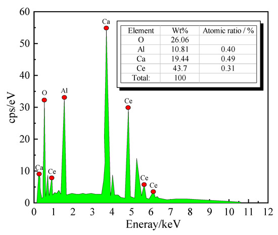 SEM was used to examine the slag, and an energy-dispersive spectrometer was used to determine the specific composition of the mineral-phase structure. Figure 2 depicts the results. It can be seen from the element-distribution map that there are some desulfurization products (CaS) in the slag, which are dispersed in the slag without aggregation. In the No.0 slag, the matrix phase structure is 3CaO·Al2O3, CaO·Al2O3, Ca2SiO4 has a dispersed distribution, and there are more developed MgO crystals. After the addition of CeO2, the Ca-Al-Ce-O compound appears (as a white-striped structure in the backscattered electron mode), and its elemental composition conforms to the Ca8Ce6Al6O26 structure by EDS analysis, as shown in Figure 3.