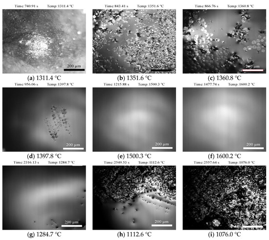 To explore whether the slag can be melted at 1600 °C, the melting of slag containing 15% of CeO2 during heating and the crystallization process during cooling was observed by a high-temperature confocal microscope. First used was a heating rate of 5 °C/s to 1200 °C, then a heating rate of 0.5 °C/s to 1600 °C, then the same cooling rate of 0.5 °C/s from 1600 °C to 1200 °C, and finally a 5 °C/s cooling rate to room temperature. The results are shown in Figure 5.