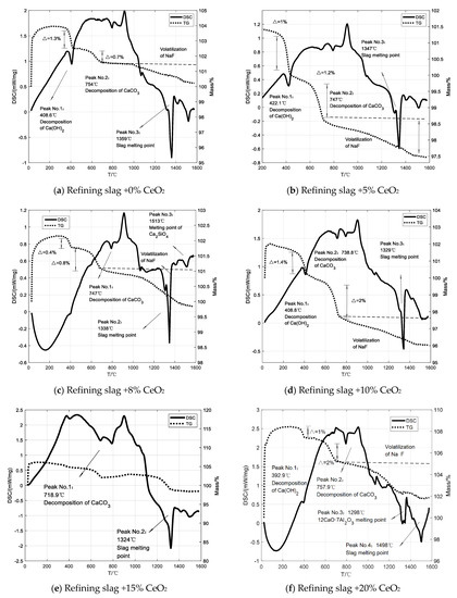 The endothermic peaks of CaCO3 and Ca(OH)2 appear in the DSC-TG curve because some of the powder after the preparation reacted with H2O and CO2 in the air. During the heating process, there is an obvious endothermic peak, which is in the range of 1300~1500 °C, and the mass changes little, so it can be judged to be the phase transition temperature of slag. It can be seen from the curve that with the increase in CeO2 content, the temperature of the endothermic peak first decreases and then increases. It can be concluded that CeO2 content has a great influence on the melting temperature of slag. By integrating the area of the endothermic peak (Hf), it is found that the heat absorption increases first and then decreases, from 74.87 J/g to 116.3 J/g, and then decreases to 94.85 J/g. It indicates that the proportion of low-melting-point minerals in the structure of slag increases and the number of production increases.