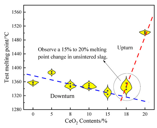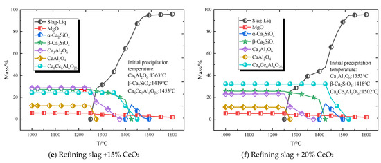 Several experiments were repeated to make the results more rigorous, and the measured melting of refining slag is shown in Figure 7, and the blue line indicates the downward trend of the melting point, and the red line indicates the upward trend of the melting point. When the CeO2 content is 5~15%, the melting point of refining slag is between 1320 °C and 1380 °C, which can meet the requirements of refining. When the CeO2 content exceeds 15%, the melting point increases rapidly, and it cannot be completely melted during the refining process, affecting the refining rhythm. The melting point of unpre-melted refining slag with 18% of CeO2 content was tested to confirm the trend’s correctness. It was discovered that the melting point of the refining slag with 18% of CeO2 content was higher than 15%, implying that the melting point decreased when the CeO2 content was less than 15%. When the CeO2 content exceeds 15%, the melting point rises. The melting temperature of slag is closely related to the mineral-phase structure. The formation of high-melting-point compounds is bound to affect the melting temperature of slag [20,21]. Therefore, it is necessary to study the law of slag mineral-phase structure.