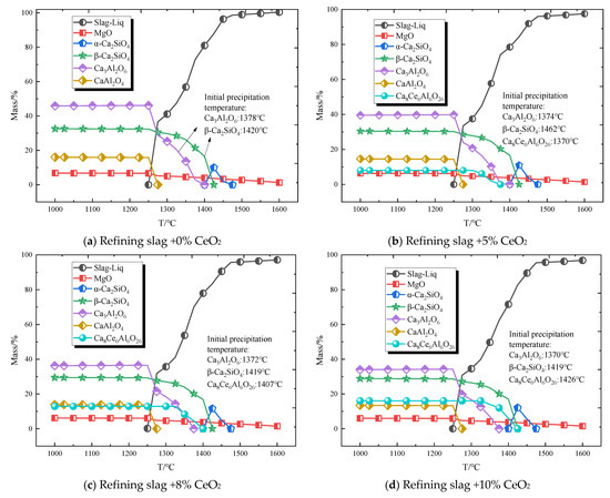 With the increase in CeO2 content, the precipitation temperature of Ca3Al2O6 and β-Ca2SiO4 decreases, and the precipitation temperature of 8CaO·3Ce2O3·3Al2O3 increases. That is, at the same temperature, the melting ratio of slag increases, which reduces the melting point of slag.