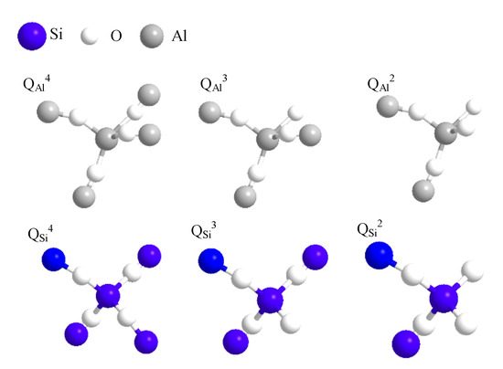 At the same time, the melting point is related to the crystal’s resistance to the temperature effect, which is determined by the crystal lattice energy and the Coulomb attraction between ions. The higher the melting point of slag, the greater the lattice energy. According to Qi’s [24] research, in the range of 0~20%wt, Ce2O3 plays an opposing role in two different phases. With the increase of Ce2O3 mole fraction in the silicate slag, the total proportion of QSi3 and QSi2 structural units(shown at Figure 9) with a high degree of polymerization will increase, and the complexity of the network will increase. With the increase of the Ce2O3 mole fraction in the aluminate slag, the relative proportion of [AlO4]-tetrahedron as the network-forming body decreases first and then stabilizes, and the network-modifier [AlO6]-octahedron’s relative proportion rises. The degree of polymerization of the slag showed a trend of decreasing first and then becoming stable. With the CaAl2O4 having an [AlO4]-hexahedral structure, the composite compounds Ca3Al2O6 and Ca8Ce6Al6O26 have an [AlO6]-octahedron structure. The total amount of the Ca3Al2O6 and Ca8Ce6Al6O26 is increasing, as is the proportion of octahedron structure. The compactness of the hexahedral structure is greater than that of the octahedral structure. As a result, the melting point of slag is decreasing due to the change of degree of polymerization. Simultaneously, the content of the silicate mineral phase does not change much with the content of CeO2, but the complexity of the structural-network increases, resulting in the trend of slag melting point decreasing first and then increasing.