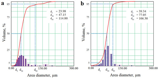 Integral curves and histograms of particle size distribution of powders: (a) PM-M; (b) PMS-M99.9.