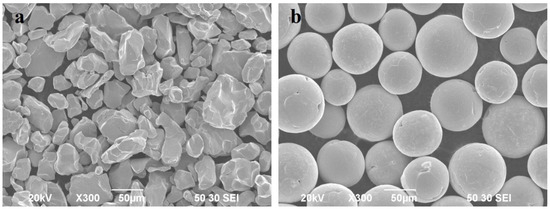 Particle morphology of (a) PM-M powder and (b) PMS-M99.9 powder.
