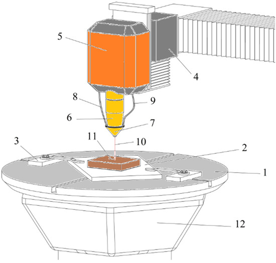 The design of LDED equipment: 1—table, 2—substrate, 3—mountings, 4—X–Y movement system, 5—laser module, 6—laser head, 7—coaxial nozzle, 8—powder feeding channels, 9—shield gas supply, 10—laser and powder flow jet, 11—deposited bead, and 12—X–Y–Z movement and rotation system.