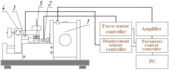 Fretting wear is a mechanical wear of bodies in contact under conditions of small oscillatory movements. Wear resistance studies were carried out on a friction machine (Figure 4), which included electromagnetic vibration device 1 for testing of friction pairs during reciprocating movement of one of the samples. The loading system in the form of a balanced lever 4 transfers the normal load to the contact zone 5, which is regulated by loads of various masses. The systems for registration and control of experimental parameters include a sinusoidal signal amplifier (MMF VEB METRA) and a system for recording and monitoring parameters, a piezoelectric force sensor 3 with a resolution of Δ = 4 mN and a signal controller, and a laser displacement sensor 2 (Dmax = ±250 μm, resolution Δ = 0.01 µm) with a controller.