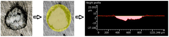 The principle of measurement is based on forming a spherical crater on the surface of a specimen. A steel ball with a diameter of Ø25 mm in an abrasive medium rotates in contact with the surface of the specimen. An RDDM-grade diamond (15 carats) with a grain size of 0 to 1 µm was used as an abrasive. The normal force applied to the sample in the contact was 0.2 N. The rotation speed was 9.9 min−1. The formed spherical crater was studied with an optical microscope, and wear volume V was calculated according to Equation (1).