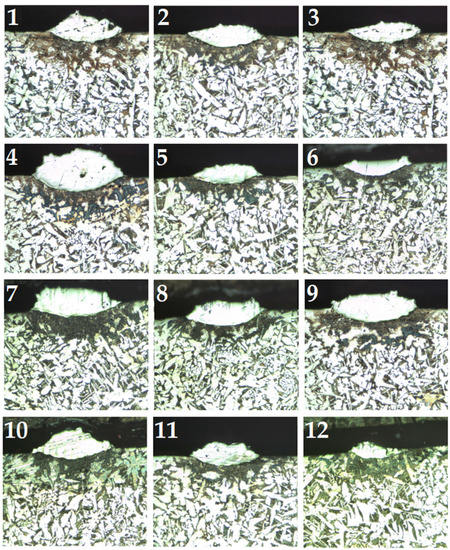Cross-section images of single beads at different LDED parameters. Bead numbers are according to the Table 5.
