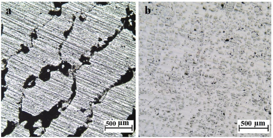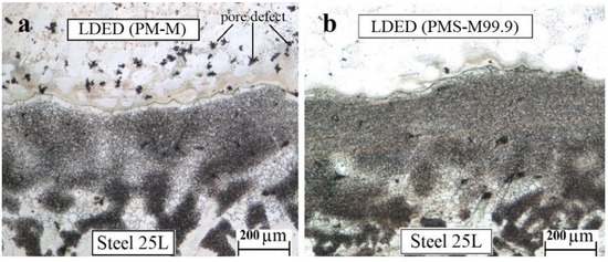Microstructure of the cross-section of the deposited layers after LDED (×50): (a) powder PM-M; (b) powder PMS-M99.9.