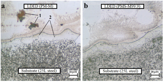 Microstructure of the Mo-steel boundary after LDED (×500): (a) PM-M powder with 1—pores and 2—cracks; (b) PMS-M99.9 powder.