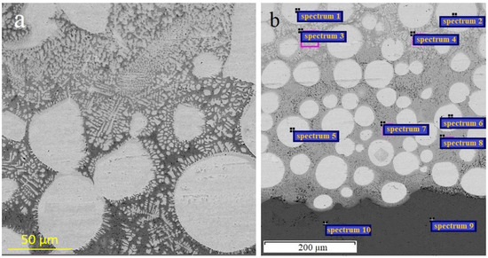 Both round and dendrite crystals of Mo of different degrees of dispersion can be observed in Figure 11a. The dendrites were mostly columnar; however, in some cases, there were dendrites with axes of second order. Figure 12 shows elements distribution maps of Fe and Mo in the area of the melt pool boundary.
