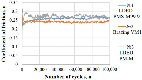During the experiments, the values of the friction coefficients were recorded. Wear volume and wear damage were visually assessed using an Olympus LEXT OLS 5000 optical confocal microscope (Olympus, Tokyo, Japan). Comparative studies of wear resistance during fretting were carried out on samples of three types that imitate the protective layer of the “body” part, made according to traditional technology and LDED of powders PMS-M99.9 and PM-M with preferential parameters.