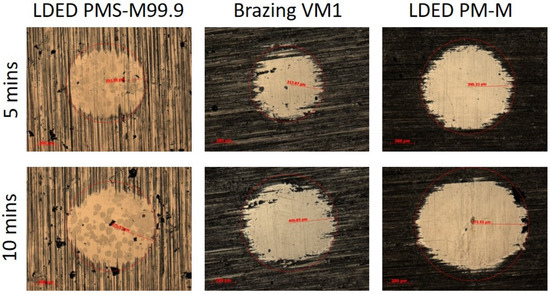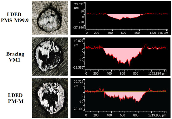It was revealed that, on the specimens made by brazing and LDED of PM-M powder, the value of volumetric wear (Table 7) was significantly higher compared to the molybdenum coating obtained by LDED of the PMS-M99.9 powder. This phenomenon can be explained by the lower hardness of the molybdenum plate compared to the deposited molybdenum layers. The layer obtained by LDED of the PM-M powder also had significantly greater wear since the structure of the deposited molybdenum had defects in the form of pores and cracks.