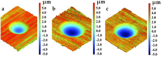 The 3D imaging of contact spot after 10 min of abrasive wear tests: (a) LDED of PMS-M99.9 powder, (b) brazing, and (c) LDED of PM-M powder.