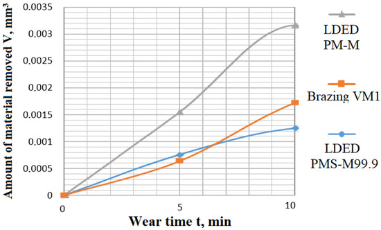 Figure 15 and Figure 16 present the results of comparative studies of abrasive wear tests of all three types of specimens: LDED of PM-M powder, LDED of PMS-M99.9 powder, and brazing.