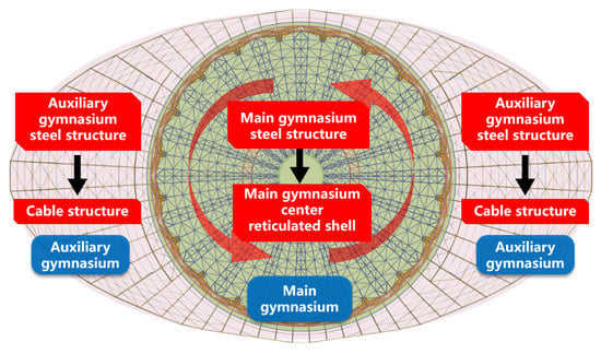 Since the steel structure in the auxiliary gymnasium was simpler than that in the main gymnasium, the truss part could be regarded as a three-span continuous beam, and the longest span was the middle one. The finite element software calculation shows that the midspan vertical displacement was very small, which is far from the degree required for safety. Moreover, the construction sequence of the tensioning cables in the main gymnasium was adopted after the auxiliary gymnasium installation. When tensioning the cables, the main structure had been installed and formed as a whole. Additionally, the structure was under reasonable stress. The installation of the auxiliary gymnasium and the tension of cables did not adversely affect the main gymnasium structure.