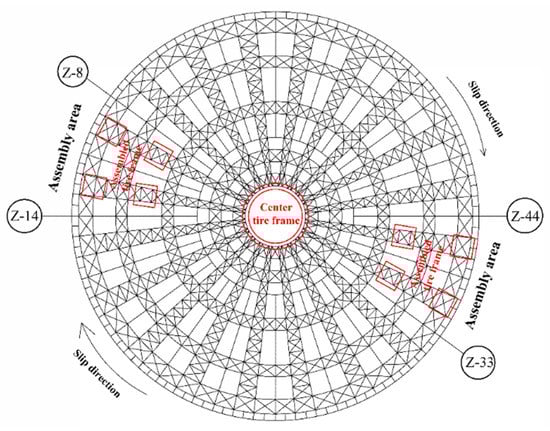 - The inner ring-supported tire frame had good overall performance, and the vertical deformation during the slip process was small. In order to simplify the calculation, the inner ring-supported tire frame was ignored, and the central ring truss was added with restricted Z-direction translation and X and Y axial rotation constraints.