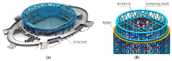 According to the project characteristics, only the outer ring slip track (a standard rail specification of 43 kg/m) was set at the foot of the laced column; a pusher was configured between every other column at each interval; and reinforcement bars were set between the column feet to enhance the integrity. No track was set on the tire frame below the inner truss ring. The inner ring truss slipped on the top of the tire frame, and a slip beam was set on the top of the temporary tire frame. Furthermore, a 70-mm-thick steel plate was placed on the upper part of the slip beam as the slip track. A roller was set above the sliding track to reduce the friction between the member of steel. The slip system is shown in Figure 5.