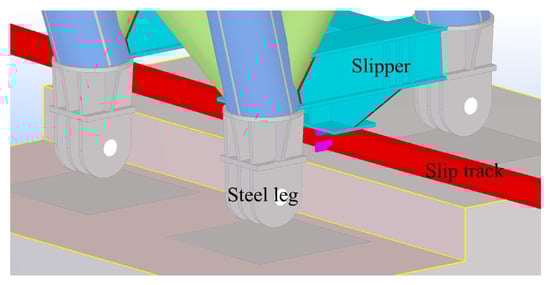 When all structural units slipped to the specified position, the tractor, slipper ear plate, and temporary reinforcement rod were removed, and the unloading operation was then performed. Four jacks were set at the foot of each laced column, a steel leg was set on the side of each slipper, and the steel leg was supported by the jack to lift the roof structure. After that, the lower slip track was removed, the pin structure was installed, and the roof structure load was transferred to the pin to complete the unloading construction. The schematic diagram of steel structure unloading is shown in Figure 7.