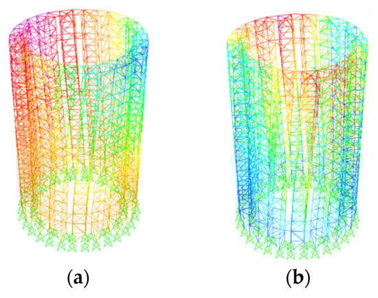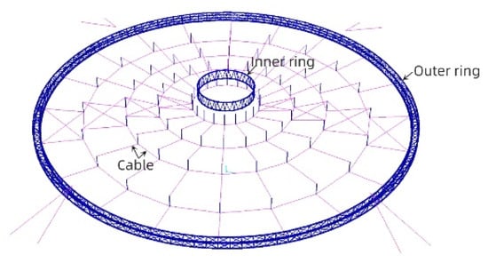 In this study, the selected gymnasium was built in Xi’an City, China and has a south–north length of 229 m, east–west width of 126 m, and a height of 37.7 m. The structure can be divided into two major parts: the main gymnasium of the center and the auxiliary gymnasium on both the north and the south sides. The overall effect of the building is shown in Figure 1. The upper dome roof in the main gymnasium is a long-span space truss suspended dome structure consisting of steel and cable parts. The steel-structured roof consists of 20 space-inverted triangular trusses. By strengthening the secondary plane truss and the ring truss, the roof is entirely connected, with each inverted triangular truss being about 48 m long. The cable structure is composed of an annular cable, a radial cable, and a brace. The overall roof is supported by 22 Y-shaped laced columns with a span of 110 m, and the lower structure is a reinforced concrete frame. The structure that forms the auxiliary gymnasium is a plane truss, with each truss supported by two frame columns. The inner truss of the auxiliary gymnasium is connected to the main gymnasium, and the outermost part is a cantilever structure. Rectangular steel pipes are used for the inner ring truss of the roof center section, and circular steel pipes are used for the inverted triangular truss, outer ring truss, and laced columns, with diameters ranging from 102 mm to 600 mm. The frame column section of the auxiliary gymnasium is ø800 mm × 20 mm, and the steel structure material of both the main and auxiliary gymnasiums is Q345B. The lower layer of the structure is composed of annular and radial cables. The cables are made with high vanadium content and have diameters ranging from 48 mm to 100 mm. Figure 2 shows the three-dimensional steel structure drawing of the main gymnasium.
