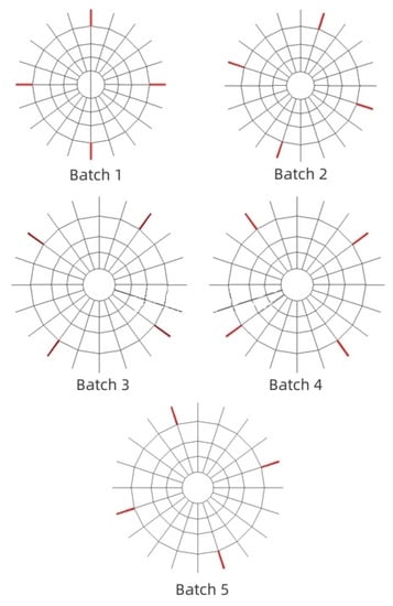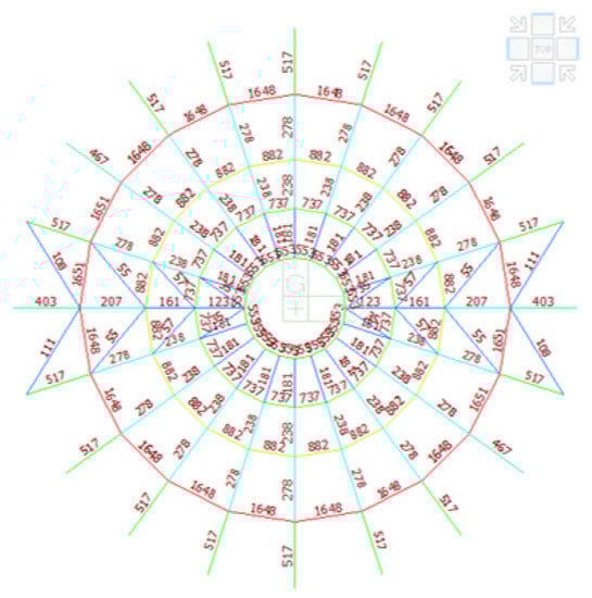 Thereafter, it was tensioned from outside to inside with 70% of the designed tension force. In this case, the steel structure roof of the main gymnasium was unloaded. After that, it was tensioned from the inside out to 100% of the design force. Finally, the stable oblique cable was installed and tensioned. The schematic diagrams for cable structure and tension sequence are shown in Figure 9 and Figure 10.