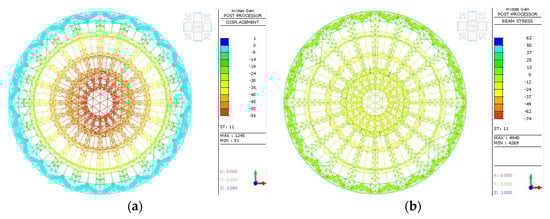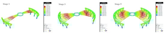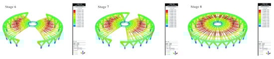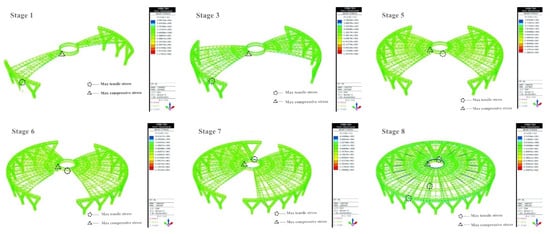 The representative construction stages of the 1st, 3rd, 5th, 6th, 7th, and 8th in the software analysis results were selected for analysis. Table 1 shows the maximum stress values of structural bars in the construction process, and Figure 11 shows the stress cloud diagram of each construction stage. It can be seen from the changes of the structure stress cloud diagram that with the gradual progress of the construction process, the structural integrity was constantly improved; the internal forces of the structural bars were also increasing; and the truss structure displacement gradually tended to stabilize. The maximum tensile stress in the structure was located at the vertical belly bar of the outer ring truss in stages 1 and 3. In stages 5 and 6, it appeared at the belly rod of the central ring truss, whereas in stage 7, it appeared at the top chord of the central ring truss, and in stage 8, it appeared at the vertical belly bar of the structure’s outer ring truss. The maximum compressive stress on the structure was located at the connection between the central ring truss and the lower chord of the inverted triangular truss in the construction simulation process.