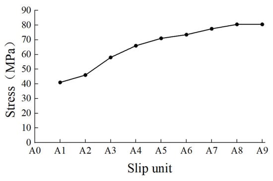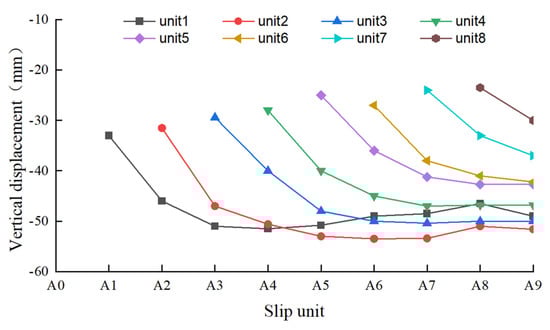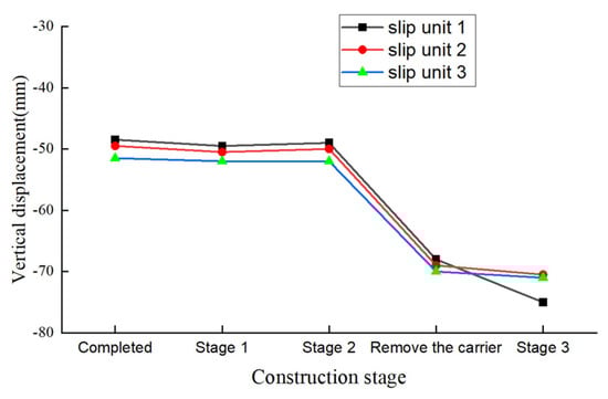 It can be seen from Figure 14 and Figure 15 that during the installation process of units 1 to 9, the vertical displacement of the control node in the span of each sliding unit increased gradually with the construction progress, and the internal force of members also increased gradually with the construction progress. This is very similar to the loading process of similar projects [], which indicates that the installation of the following structure will increase the overall internal force and displacement of the structure. The existing structure’s displacement and the existing members’ internal force will accumulate continuously during the construction and installation. However, the increasing amplitude gradually decreases and finally becomes stable, indicating that the stiffness of the space truss suspended dome structure increases with the structural integrity during construction.