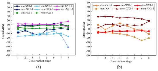 Figure 21 compares the stress simulation (sim) and monitoring (mon) values of representative measuring points in the truss structure’s upper chord, lower chord, and belly bar during the slip construction stage. It can be seen that although there were deviations between the simulation and monitoring results at some measuring points, the trends between the two were the same. There was a big difference between the simulation and monitoring results at the measuring points near the central ring because, for the simplified calculation, a supported tire frame for the central ring was set up in the model.