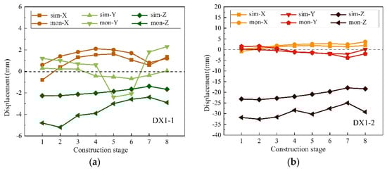 The bar displacement is an important control index in the space structure construction, and two measuring points on the lower chord of the radial inverted triangular truss were selected. The comparison of displacement results of each measuring point is shown in Figure 22. It shows that the structure’s displacements along the X and Y directions were small during the construction process, and several measuring points underwent sudden changes during construction 5 and 6. Structural displacement mainly occurred in the Z (vertical) direction, but it presented a decreasing trend with the construction progress.