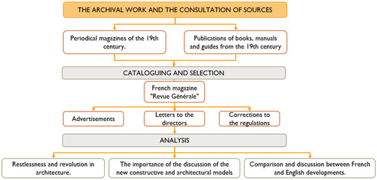 This research was carried out with comprehensive analysis and desk research (Figure 2). The archival work and the consultation of sources formed the basis of the research. It also consolidates and draws conclusions based on the descriptions and periodical publications of the time. Each engineer and architect of the time who contributed to the technological advances of the historical period under study is clearly identified with a biographical summary in Appendix A.