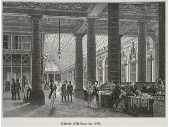 We know of examples of the first iron roof reinforcements in France [2,3], before the cast-iron bridges in Britain; among these examples are the vaulted iron and glass structures of the Galerie D’Orléans (1840) (Figure 3) and the pavilion of the Jardin des Plantes (1834–1836) (Figure 4), Fontaine [A1] [4,5] and Rohault [A2] [6] created a fundamentally new system for 19th century architecture, long before these advances were translated into English architecture.