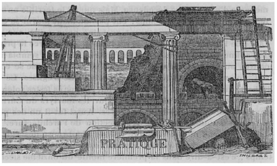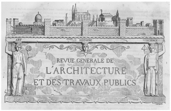- Main Header Engraving in the First Issue of the Magazine. Revue Générale de L’architecture et des Travaux Publics, France, 1840: Volume 1, col.1. p. Available online: https://portaildocumentaire.citedelarchitecture.fr/pdfjs/web/viewer.html?file=/Infodoc/ged/viewPortalPublished.ashx?eid%3DIFD_FICJOINT_FRAPN02_RA_1840_01_PDF_1 (accessed on 20 January 2022).