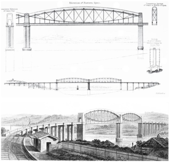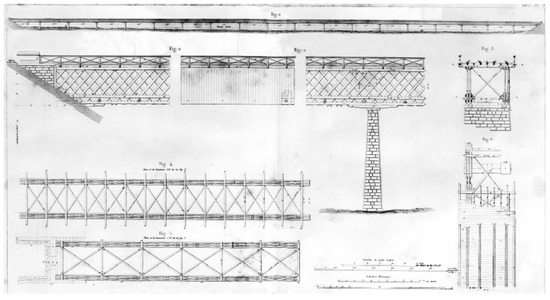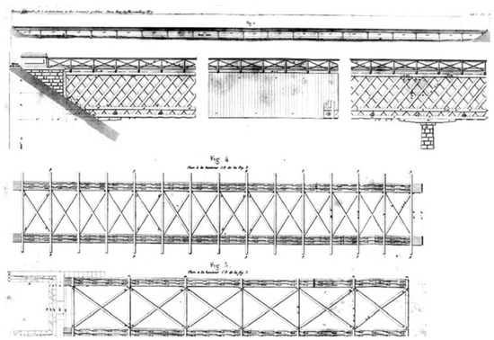 - Chevalier, M.M. Bridge over the James River. Longitudinal Elevation and Section Located in Richmond, Virginia. (Engraving). Source: "Revue Générale de l’architecture et des Travaux Publics", France, 1840: Volume 1, (Pl.3). Available online: https://portaildocumentaire.citedelarchitecture.fr/pdfjs/web/viewer.html?file=/Infodoc/ged/viewPortalPublished.ashx?eid%3DIFD_FICJOINT_FRAPN02_RA_1840_1801_PDF_1841 (accessed on 15 March 2022).