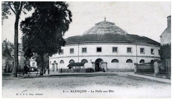 La Halle aux Blés. Photograph showing the replacement of the old wooden structure of the dome with iron and copper ribs according to the design of Bellangé and Brunet in Paris 1811–1820 by Bellangé. Source: Extract from Dictionnaire des rues et monuments d’Alençon (Alain Champion, Éditions Cénomane, 2003).