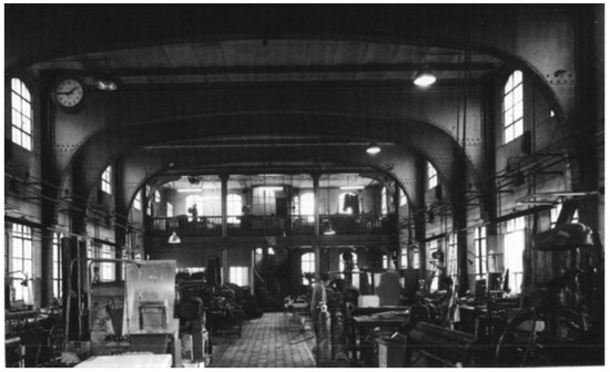 The first building conceived as a skeleton and executed entirely with a metal structure was also built near Paris, the Menier chocolate factory (Figure 9), in Noisiel-sur-Marne, by Jules Saulnier [A7] [21,22] between 1871 and 1872. It was the first building whose exterior brick walls had a merely enveloping function and where all the load lines were situated within a metallic structure, minimizing the structure and functioning as a single whole. The structure included, for the first time, foundations, brace beams, pillars and beams, all metallic and all with a specific, known and calculated function [23].
