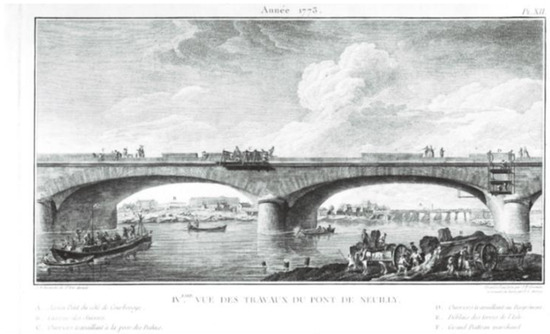 It had also been in Paris where for the first time, in 1747, a school of civil engineers (École des Ponts et Chaussées) [A8] was established, and in Méziers, a school of military engineers in 1748 [A9], almost 100 years before Viollet Le Duc’s [A10] project in Vézelay [24,25,26]. We can therefore assume that there was already in France a clear awareness of disciplines, if not separate, then at least complementary and distinct. Before 1750, prior to the creation of these official engineering schools, bridges were considered a derivation of the problem of the vault, so architects were in charge of their design and construction, until Rodolphe Perronet (1708–1794) [A11] [27,28], organiser of the school of civil engineering and director of the École des Ponts et Chausseés, understood that the rules and tables applied to the calculation of dimensions needed a scientific method and calculations based on the mechanics and resistance of materials. With this theory of calculation, he built the first bridge based entirely on scientific principles, the Neuilly Bridge over the Seine between 1768 and 1772 (Figure 10) and was thus able to reduce its piers to a tenth of their length, leaving an open path to be followed in the following century on the use of mathematics and stress analysis in the practical application of bridges. It is difficult to understand how bridge design became the almost exclusive competence of engineers and engineering; on the one hand, Perronet, despite being an architect, disseminated his knowledge and theories in engineering schools, thus creating a breeding ground very different from the one that was being established in architecture schools, which were more closely linked to history and fine arts. On the other hand, the engineers together with the mathematicians knew how to obtain a direct application for these new techniques very soon [29]. For example, Perronet was a civil engineer, and together with three mathematicians [A12], was the first to scientifically study the structure of the dome of Saint Peter’s in Rome as a result of structural doubts about its stability.