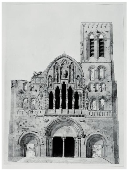 Abbey of Santa Magdalena de Vézelay. Engraving of the main façade in the state prior to the restoration works directed by Viollet Le Duc. 1840. Source: The Facade of La Madeleine de Vézelay. Technique: pen and ink and watercolour on paper) Paris, Caisse Nationale des Monuments Historiques.
