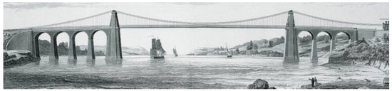 Menai Bridge. General view of the suspended structure designed by Telford, Wales. 1826. Source: “Scottish Engineering Hall of Fame”. engineeringhalloffame.org. August 2015.