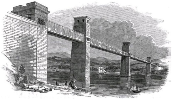 In 1840, in the first issue of the Revue Générale, the theory of suspension bridges was published in France. Before this, the Menai Bridge had been built in Wales in 1826 by Telford [A13] [31,32,33], with the suspension structural solution (Figure 12). This fact might suggest that Britain was more advanced in this type of construction than France, however, analysing it in context, we discover that the engineering basis of this type of bridge was not yet under control. The Menai bridge collapsed twice in the first twenty years. Telford’s Menai Bridge lies 1 mile east of where the Britannia Bridge was later built. This bridge was the first fixed road link between Anglesey and the surrounding environment. The popularization of the train as a means of transportation created the need to build a second bridge and it was Stephenson, the engineer commissioned to build the Britannia Bridge close by, and who [A14] [33,34] in 1846 rejected the proposal to use the same model as the Menai. Instead, (Figure 13), he raised the structure as a large tubular box girder used for the interior, moving away from the suspension theory that had caused problems with the Menai Bridge. (Figure 14) [35] and (Figure 15) [36].