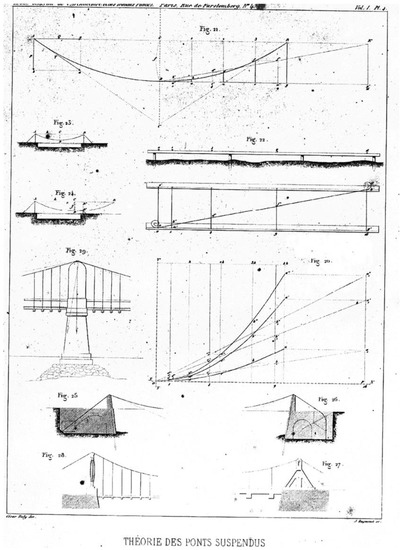 Graphical extract from the article suspension bridge theory. Source: “Revue Générale et des Travaux Publics”, 1840. Vol.1, (Pl.4). Edited by César Daly. Reference [36].