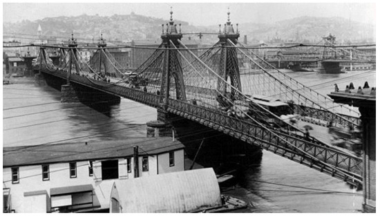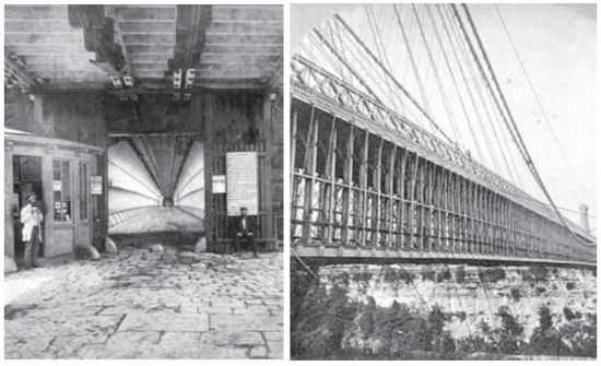 A year later, in the opening of this aqueduct, Roebling built the Monongahela Bridge in Pittsburgh, where, for the first time, the principle of the pendulum was applied to compensate for adjoining spans under the action of unequal loads and was the beginning of a series of four hanging aqueducts (Figure 16 and Figure 17) [40].