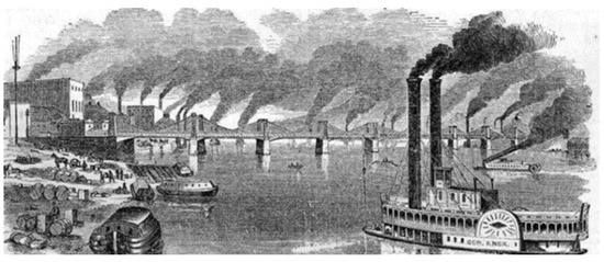 Monongahela Bridge, Engraving of the general view of the bridge designed by Roebling. In the foreground one of the ships of “General Knox”. Pittsburgh. 1846. Source: Engraving from issue Ballou’s Pictorial, 21 February 1857.